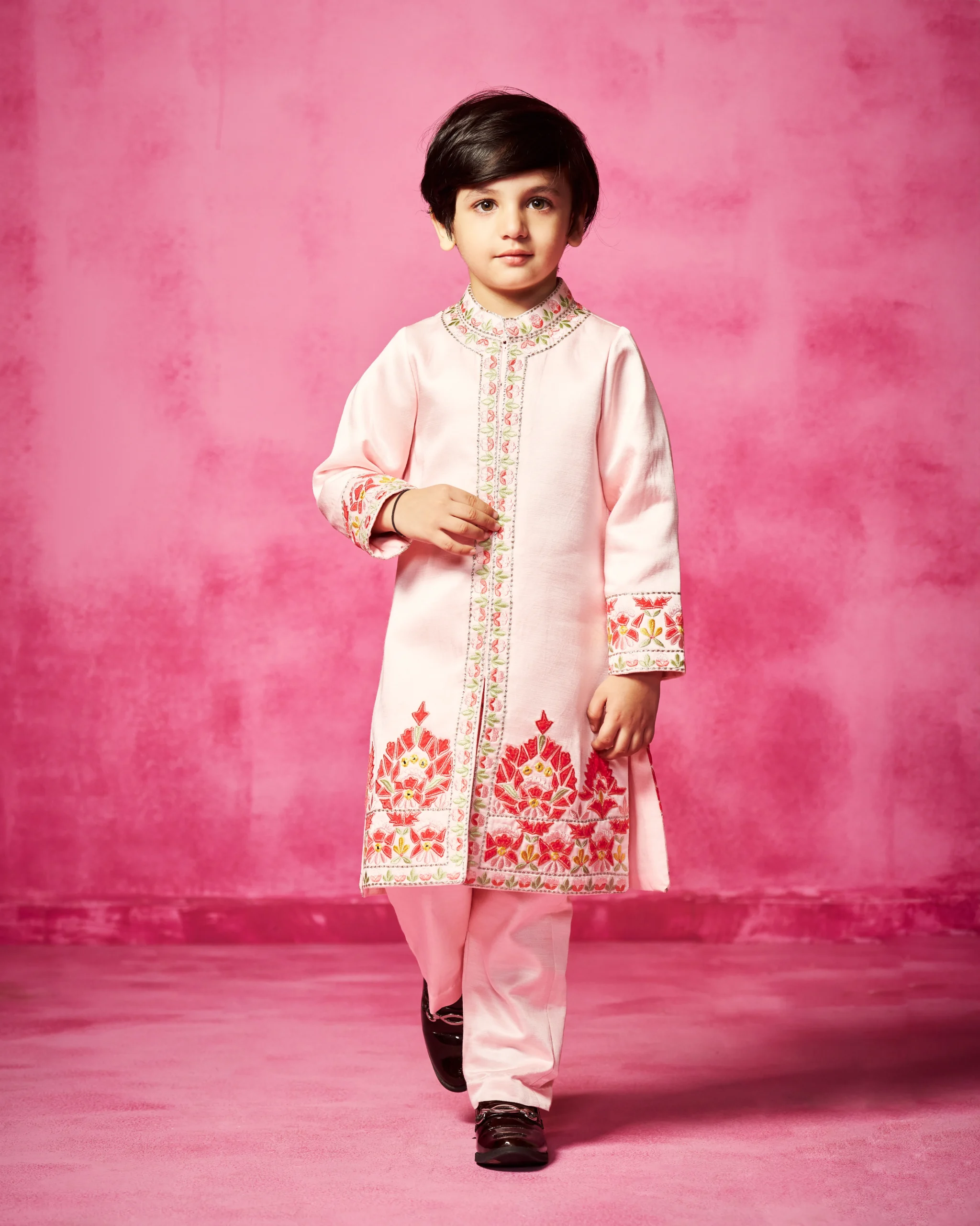 Light Pink Velvet Patchwork Embroidered Sherwani Set with Narrow Pants