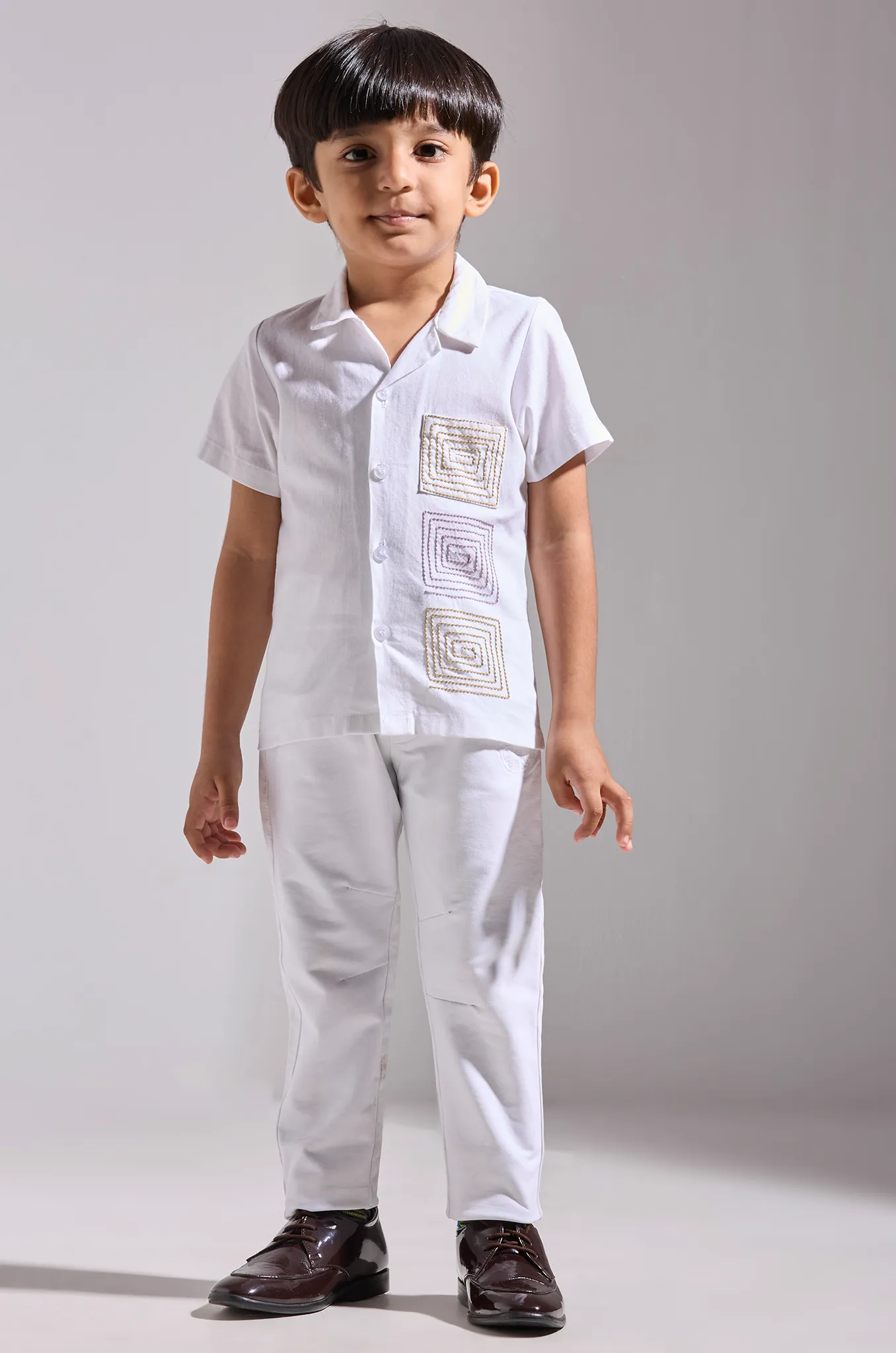 Ivory Cotton Linen Shirt with Contrast Stitch Pocket Detail