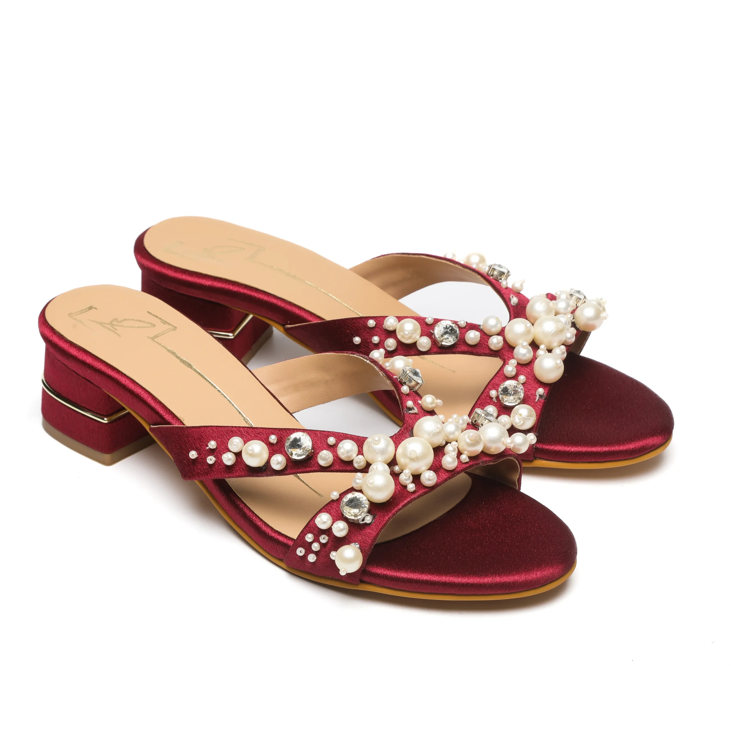 Wine Embellished Pearl Block Heels
