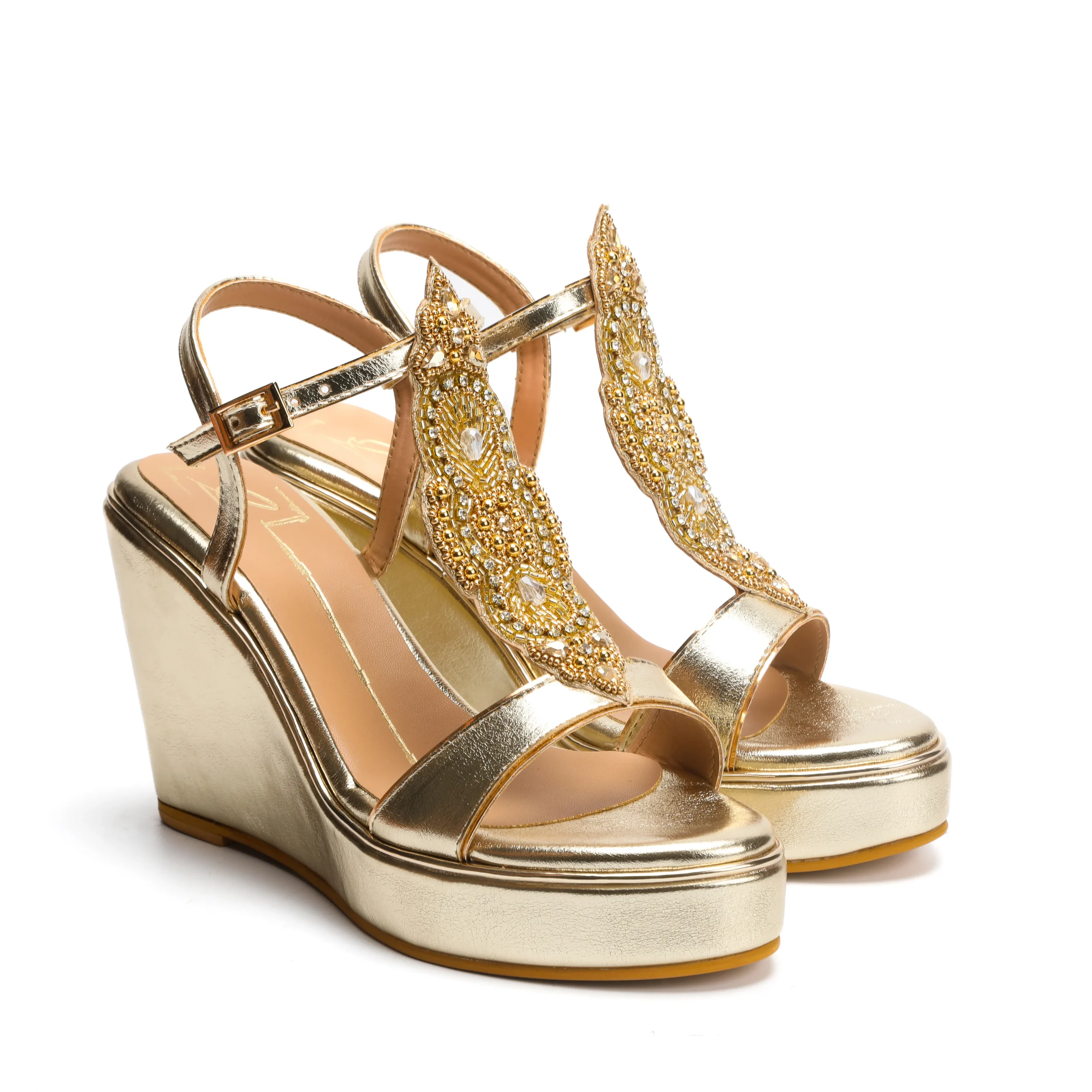 Gold Embellished Ankle Strap Wedge Heels