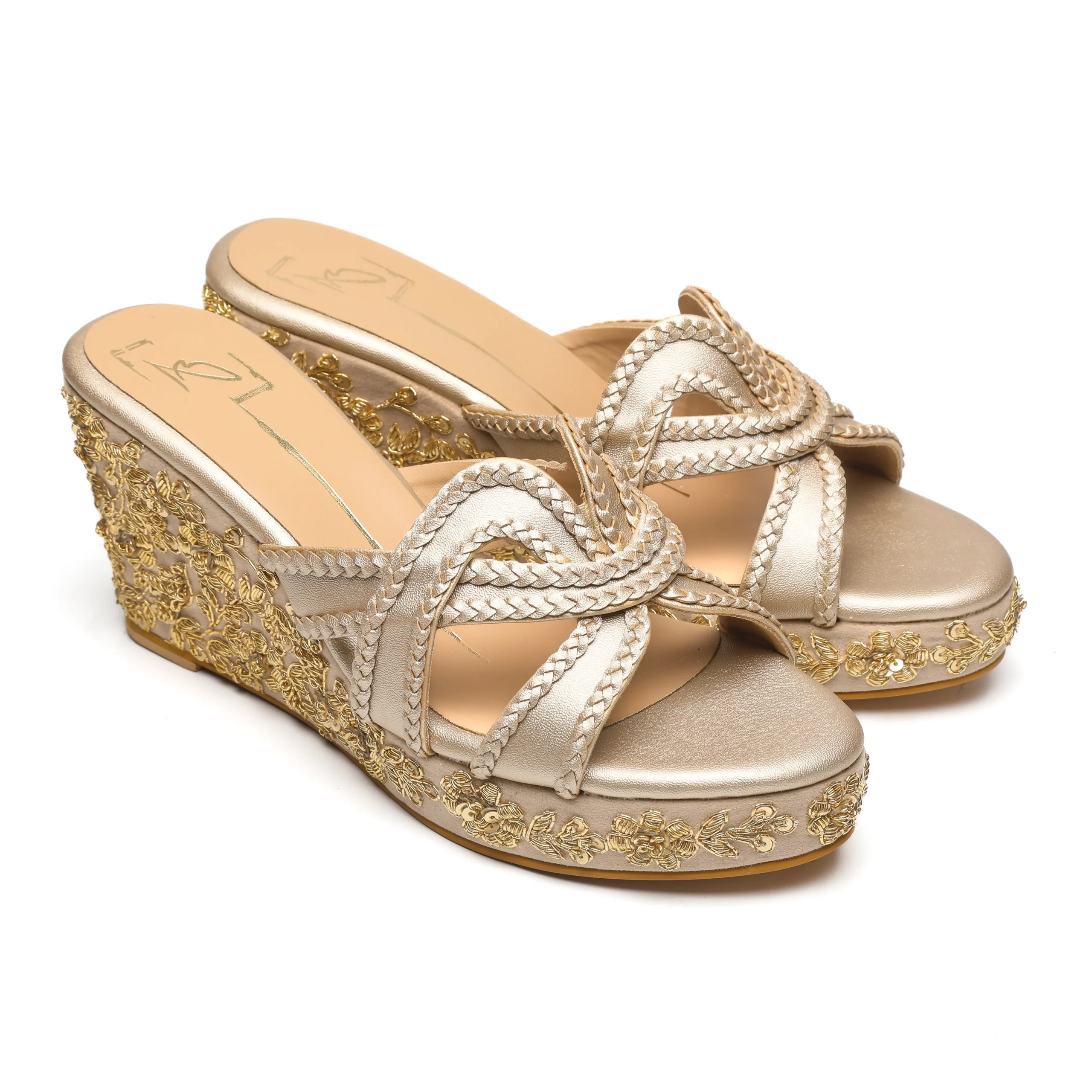 Gold Embroidered Platform Wedge Heels