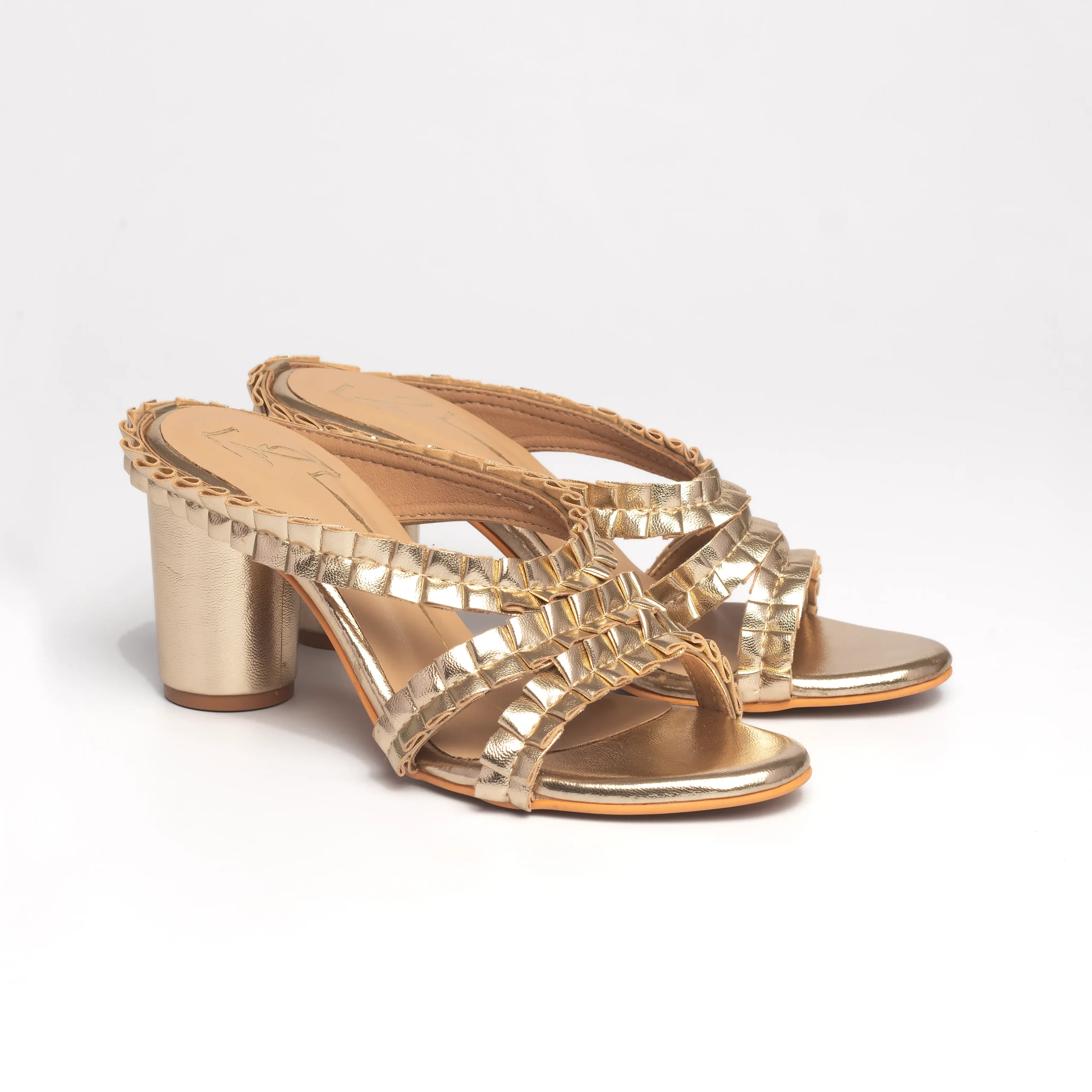 Gold Textured Cross-Strap Block Heels