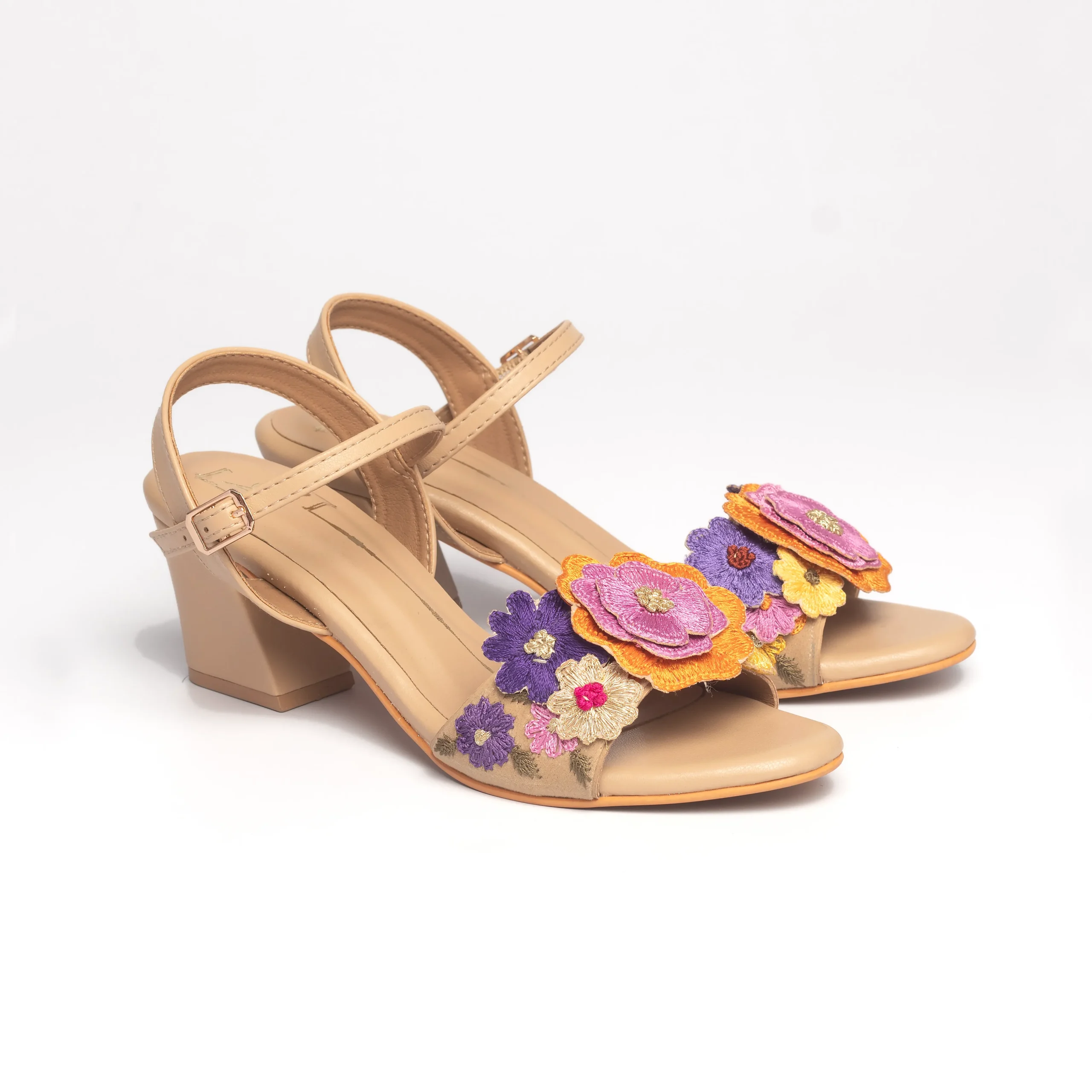 Beige Floral Embroidered Ankle-Strap Block Heels