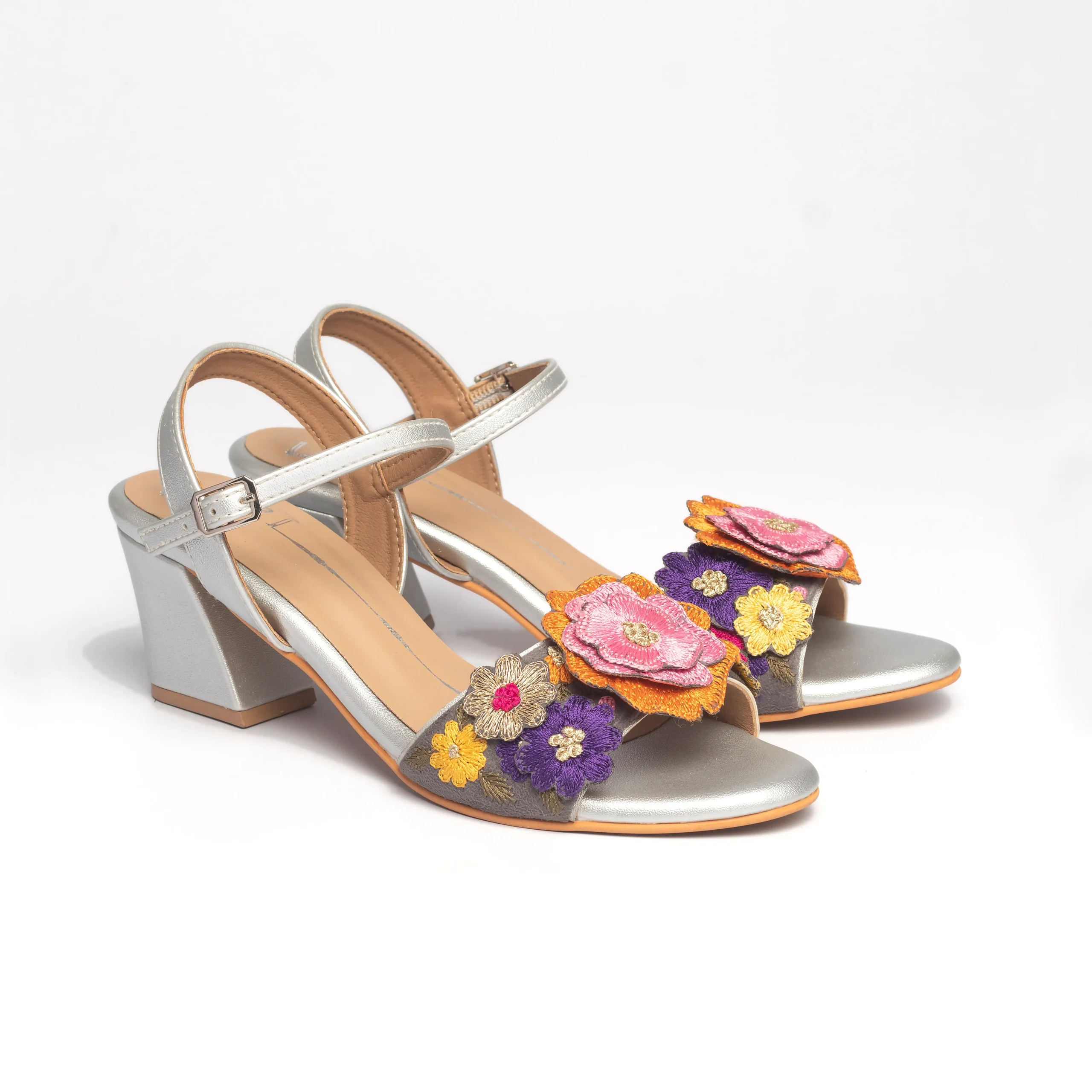 Silver Floral Embroidered Ankle-Strap Block Heels