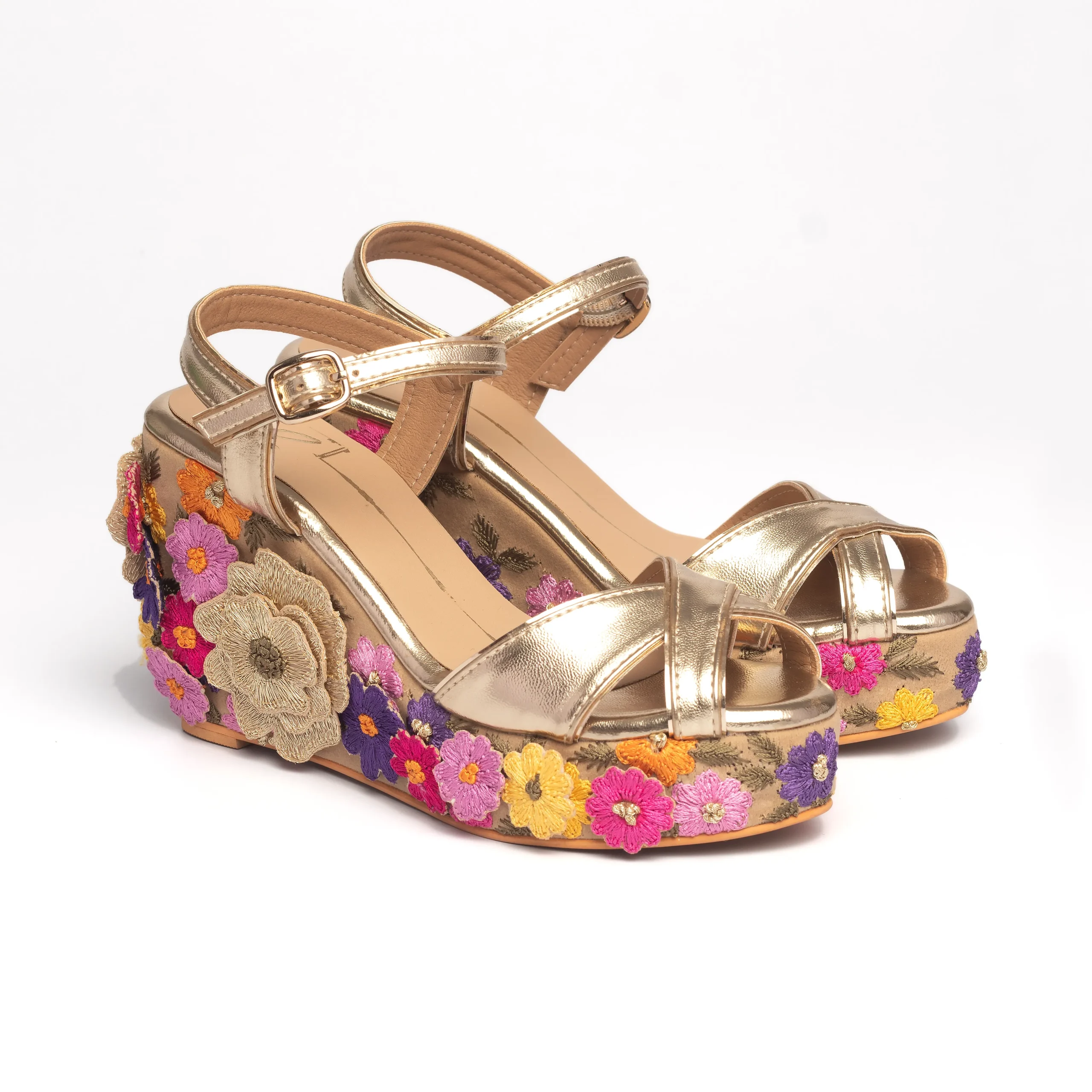 Gold Floral Embroidered Platform Wedge Heels