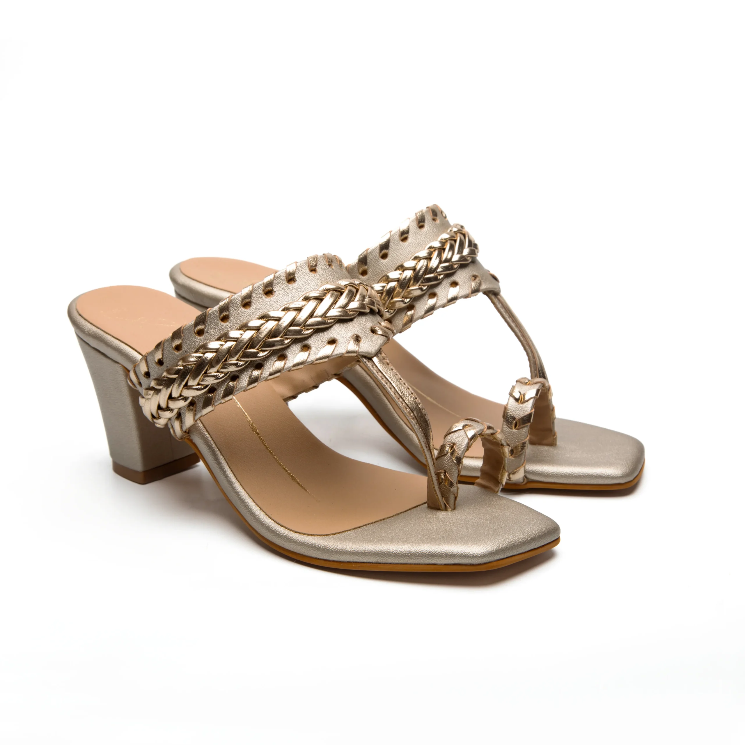 Gold Textured Braided Strap Block Heels