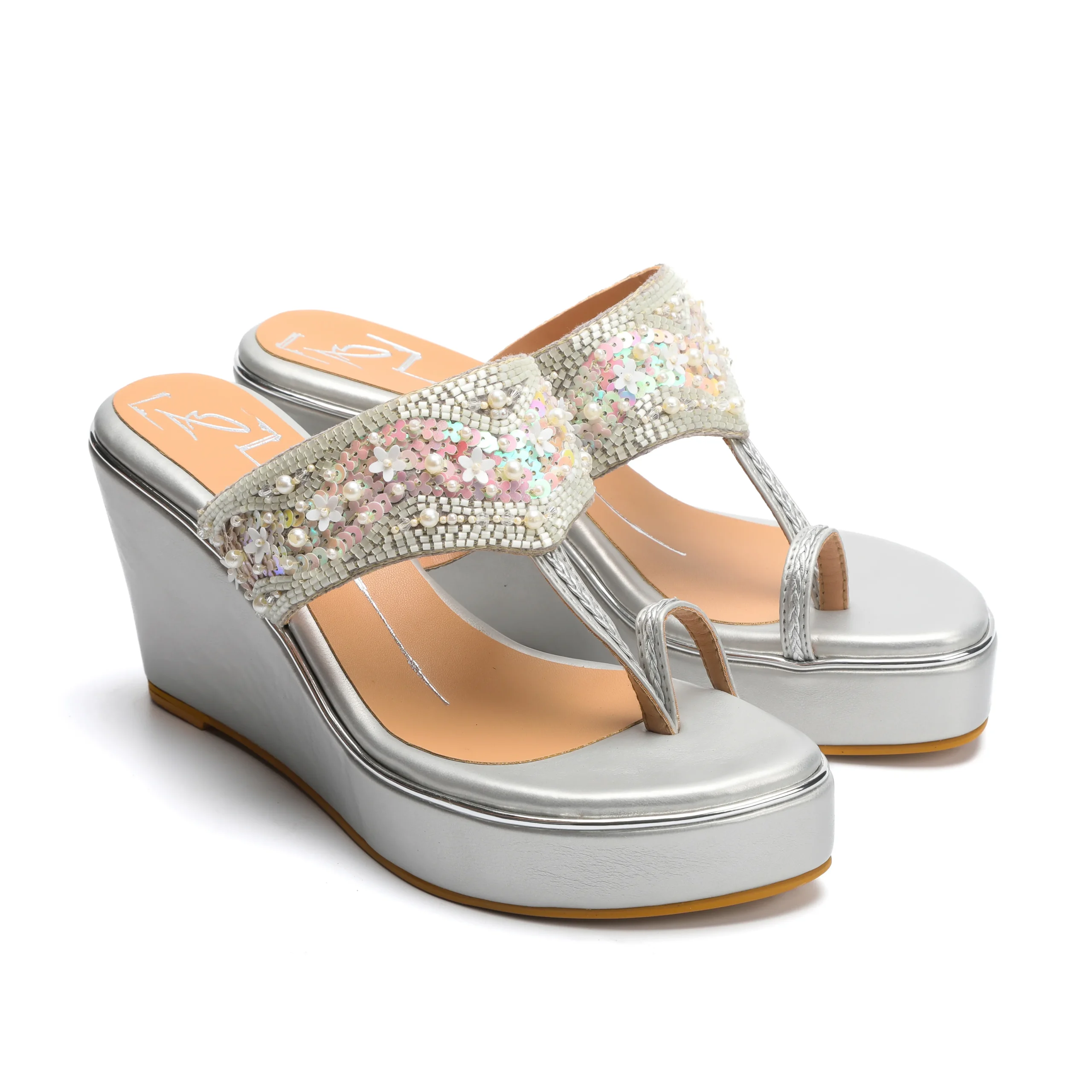 Silver Floral Embellished Wedge Heels